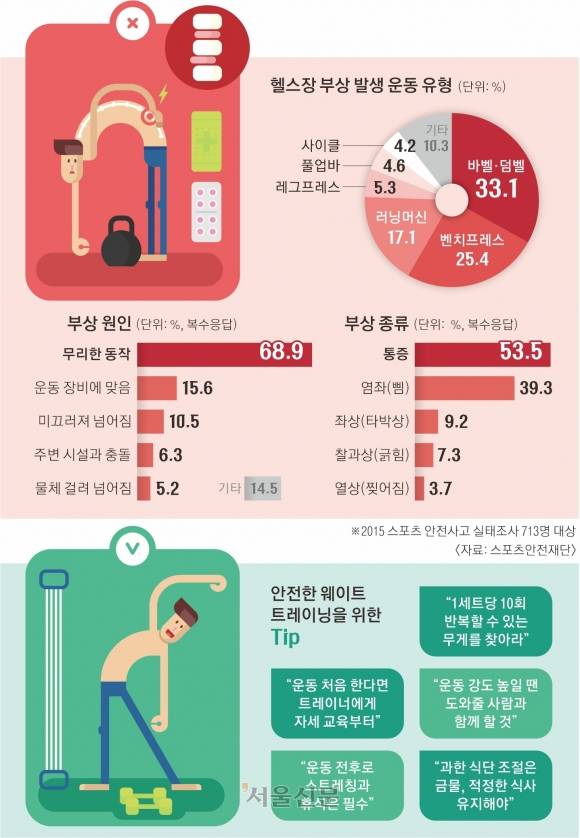3일 스포츠안전재단에 따르면 근력 강화 운동을 하다가 다친 10명 중 7명(68.9%)의 경우는 ‘무리한 동작’이 원인이었다. 바벨·덤벨(33.1%), 벤치 프레스(25.4%), 러닝머신(17.1%) 순으로 많이 다쳤다. 부상 종류는 통증(53.5%)과 염좌(39.3%), 좌상(9.2%) 순이었다.