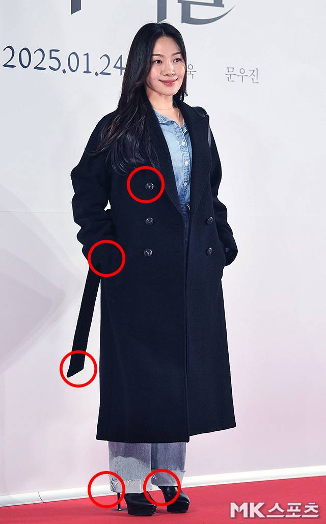 이날 시사회에서 최희서는 더블 버튼 디테일이 돋보이는 블랙 롱코트에 데님 셔츠와 와이드핏 데님 팬츠의 청청패션을 매치해 세련되면서 캐주얼한 극장룩을 선보였습니다.