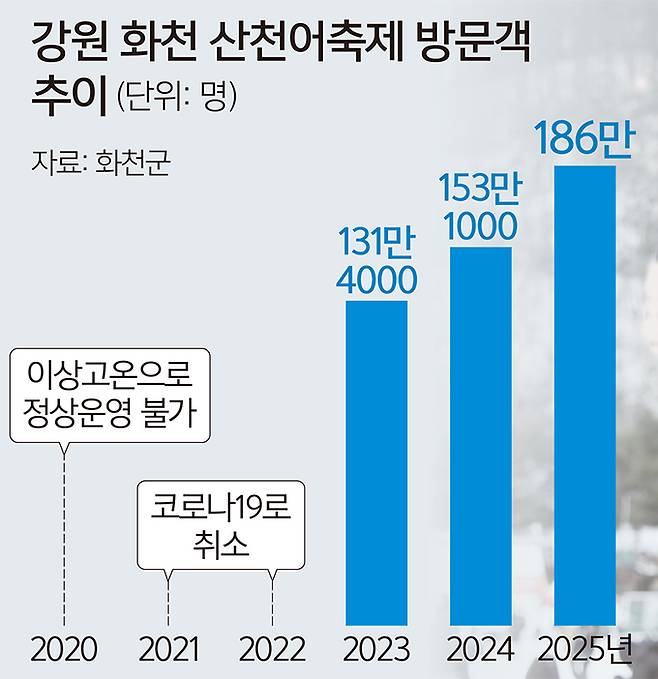 올해 20회를 맞은 화천 산천어축제에는 2003년 첫 개최 이후 가장 많은 186만명이 찾은 것으로 집계됐다. 종전 최다 방문객 기록을 세운 2019년 184만명보다 2만명 많다. 외국인 관광객 역시 지난해(8만5000명)를 뛰어넘은 12만2000명을 기록했다.