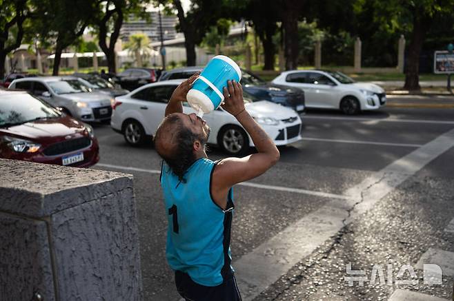 [부에노스아이레스=AP/뉴시스] 3일(현지 시간) 아르헨티나 부에노스아이레스에서 한 거리 공연자가 교통 신호 대기 중인 차량을 대상으로 저글링 공연을 하다가 물을 마시고 있다. 부에노스아이레스는 33도에 달하는 무더운 날씨를 보이고 있다. 2025.02.04.