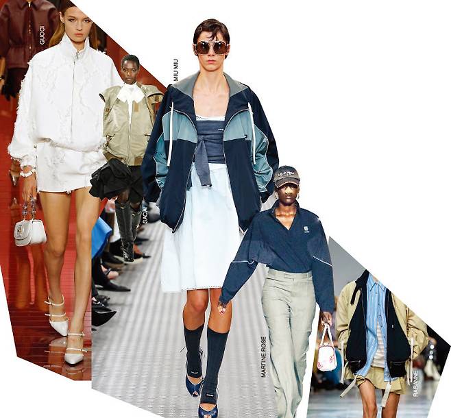 일상 속에서 아웃도어를 자연스럽게 받아들이고자 하는 움직임은 고프코어가 트렌드를 넘어 하나의 문화로 자리매김하고 있음을 보여준다. 보다 가볍고 한층 점잖아진 고프코어 룩이 이번 시즌 절정을 맞았다. 독보적인 존재감을 드러낸 건 마틴로즈. 모터사이클에서 영감을 받은 보머 스타일의 톱과 대조를 이룬 슈트 팬츠가 더없이 시크한 무드를 자아냈다. 오피스 룩으로서의 활용도도 무궁무진하다. 셔츠와 스커트 룩에 보머 재킷을 천연덕스럽게 매치한 라반이나 우아한 프린지 집업 재킷과 스커트 셋업을 선보인 구찌를 참고하면 된다. 사랑스러움을 한 스푼 추가하고 싶다면 튜브톱, 스커트, 보머 재킷의 조합을 따른 미우미우와 하늘하늘한 블라우스에 스커트, 집업 점퍼를 착용한 사카이의 믹스 매치도 좋은 레퍼런스가 될 것이다.