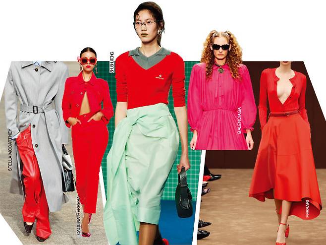 정열적이고 도전적인 레드 컬러는 스타일의 자신감을 높이는 데 도움을 준다. 이번 S/S 컬렉션에선 머리부터 발끝까지 빨갛게 물들인 인간 체리를 연상시키는 올 레드 룩이 연이어 등장했다. 대표적으로 페라리는 동일한 레드 컬러에 명도와 채도, 질감을 달리한 톤온톤 룩으로 강렬한 잔상을 남겼다. 셔링이 풍성하게 잡힌 레드 드레스로 시선을 모은 발렌시아가와 레드 재킷과 팬츠 셋업 룩을 선보인 캐롤리나헤레라 역시 마찬가지. 반면 셔츠와 슬랙스, 트렌치코트 등 실용적인 오피스 룩에 레드 컬러를 한 방울 섞어 활기를 준 스텔라맥카트니와 슈슈통은 보다 현실적인 스타일링 답안을 내놓았다.