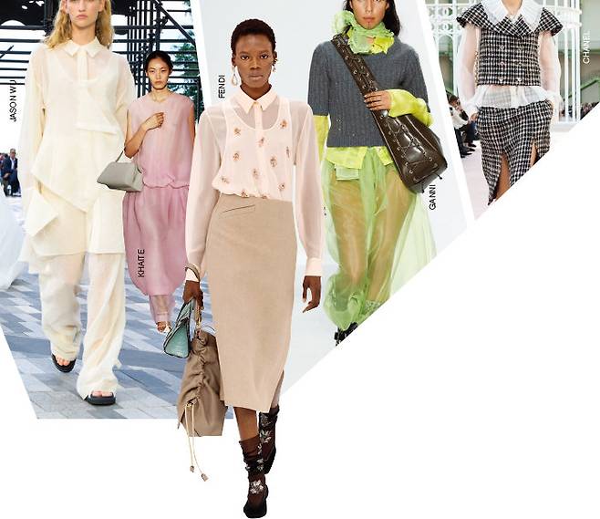이번 시즌 시스루를 입는 색다른 방식은 바로 겹겹이 쌓아 올리는 것이다. 가벼운 시스루 셔츠 위에 시폰 베스트를 겹쳐 입고 펜슬 스커트로 격식을 지킨 펜디의 룩처럼 말이다. 클래식의 대명사 샤넬은 전통적인 트위드 셋업 재킷 안에 풍성한 볼륨이 돋보이는 시폰 블라우스를 곁들여 여성미를 배가했다. 시스루 셔츠, 베스트, 스커트, 팬츠 등 동일한 컬러와 소재의 아이템을 겹쳐 입어 마치 한 벌처럼 보이도록 연출한 제이슨우와 케이트도 런웨이를 환히 밝히며 트렌드에 동참하고 나섰다. 그런가 하면 비비드한 색감의 충돌을 즐기며 자신만의 스타일을 설파한 가니도 있다.