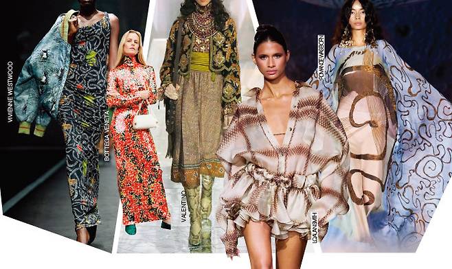 을사년 푸른 뱀의 해가 밝았다. 예부터 신비롭고 관능적인 존재로 여겨지던 뱀을 향한 열망은 패션계 여기저기서 감지됐다. 올봄에는 조금 더 특별하다. 친환경을 넘어 '필환경’ 시대로 접어들면서 동물의 가죽을 착취하는 방식이 아닌, 디지털 프린팅이나 신소재를 접목한 윤리적인 공정 방식을 실천하고 나선 것. 매년 자연을 벗 삼은 컬렉션을 선보이는 라콴스미스는 뱀의 비늘을 형상화한 파이톤 패턴 시폰 셋업들로 부드럽고 유려한 곡선미를 만들었다. 한땀 한땀 수놓은 시퀸 디테일로 고혹적인 우유뱀의 비늘을 표현한 보테가베네타의 레드 드레스도 눈길을 사로잡았다. 이 외에도 고전적인 아르누보 스타일의 발렌티노와 뱀이 똬리를 틀고 있는 모습을 형상화한 비비안웨스트우드, 예술적인 프린트를 앞세운 로맨스워즈본의 피스들까지 선택의 폭을 넓히며 우리의 소비 욕망을 꿈틀거리게 한다.