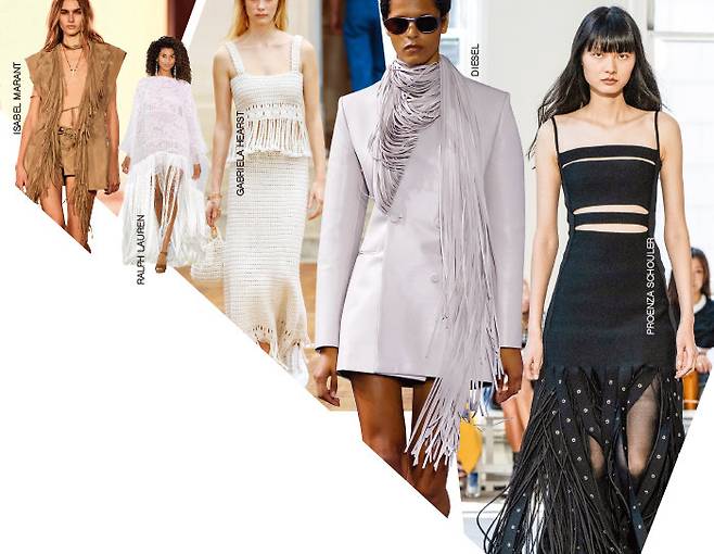 프레디 머큐리도 울고 갈 보헤미안 스타일의 대표 주자는 단연 이자벨마랑. 2025 S/S 컬렉션은 그야말로 보헤미안을 상징하는 디자인 요소의 집합체였다. 스웨이드 소재의 프린지 장식 톱과 팬츠에 웨스턴 부츠까지, 마치 서부영화 속 한 장면을 보는 듯했다. 발목까지 떨어지는 거대한 프린지 장식 드레스로 장관을 연출한 브랜드들도 눈에 띄었다. 가브리엘라허스트와 프로엔자슐러, 랄프로렌이 대표적인 예. 모델의 힘찬 워킹에 맞춰 프린지 장식들이 서로 겹치고 흘러내리며 유기적인 리듬을 만들어냈다. 또 테일러링에 기본을 둔 디젤은 분쇄기에 넣은 것처럼 잘려나간 프린지 장식 재킷으로 보헤미안 시크 스타일을 재정의했다.