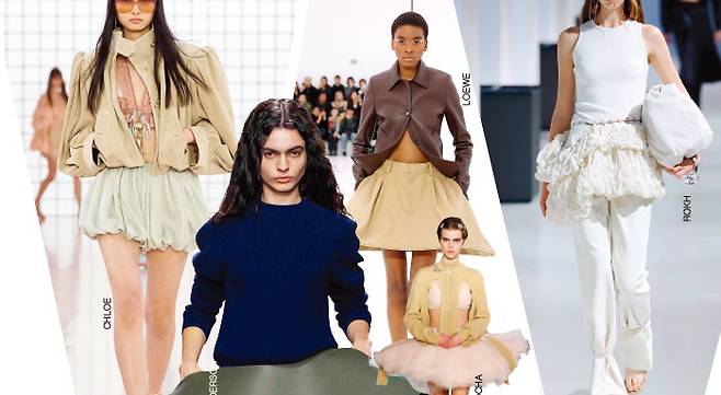 지난해 이미 한 차례 패션계를 휩쓴 바 있는 발레코어 룩이 동면에서 깨어났다. 이번 시즌엔 발레리나의 상징인 튀튀 스커트가 대세로 떠올랐다. 시몬로샤는 춤추듯 넘실대는 풍성한 볼륨의 튀튀 스커트로 고유의 로맨틱한 분위기를 드러냈다. 국내 디자이너 황록이 이끄는 록은 또 어떤가. 특유의 장기가 돋보이는 셔링과 드레이핑 기법으로 튀튀 스커트의 격식을 한 단계 끌어올렸다. 끌로에의 둥글게 부푼 코쿤 실루엣 재킷과 튀튀 스타일의 셔링 스커트는 지금 당장 입고서 거리를 활보하고 싶을 정도. 여기에 튀튀에서 영감을 얻은 로에베와 JW앤더슨의 극단적인 후프 스커트까지, 그간 실용성을 기반으로 하는 평범한 하의의 개념에 머물러 있던 스커트의 한계를 시험하는 듯했다.