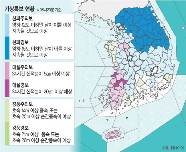 기상청은 다음 주 초까지 최저기온이 영하 10도를 밑도는 강추위가 이어질 것으로 예보했다. 이번 추위는 한반도 북쪽에서 대기가 동쪽에서 서쪽으로 순환하지 않고 정체된 상태에서 차가운 공기가 곧바로 내려오면서 발생한 것으로, 강한 칼바람의 영향으로 햇볕이 드는 오후에도 체감온도가 영하권을 기록할 것으로 예상된다. 전국적으로 순간풍속이 초속 15m 이상인 곳도 있겠으며, 충남·호남 서해안 등에는 강풍특보가 발효됐다. 기상청은 오는 6일까지 충남 서해안 5∼10㎝, 충청 내륙 3∼8㎝, 호남 5∼20㎝(전북 서해·내륙 최대 30㎝ 이상) 정도의 눈이 쌓일 것으로 예보했다.