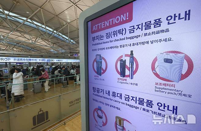 대한항공과 진에어는 지난해 5월 31일부터 항공기 출발 5분 전 “보조 배터리나 라이터는 몸에 지니고 있어달라”라는 내용의 기내 안내 방송을 하고 있는데 이어 에어부산 화재 사고가 벌어진 뒤부터는 탑승 수속 시에도 추가 안내를 하고 있다. 2025.02.04. ks@newsis.com
