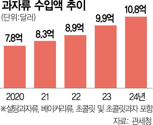 앞서 과자류 수입액은 2020년 7억 7554만 달러를 기록한 뒤 5년 연속 꾸준히 증가해왔다.