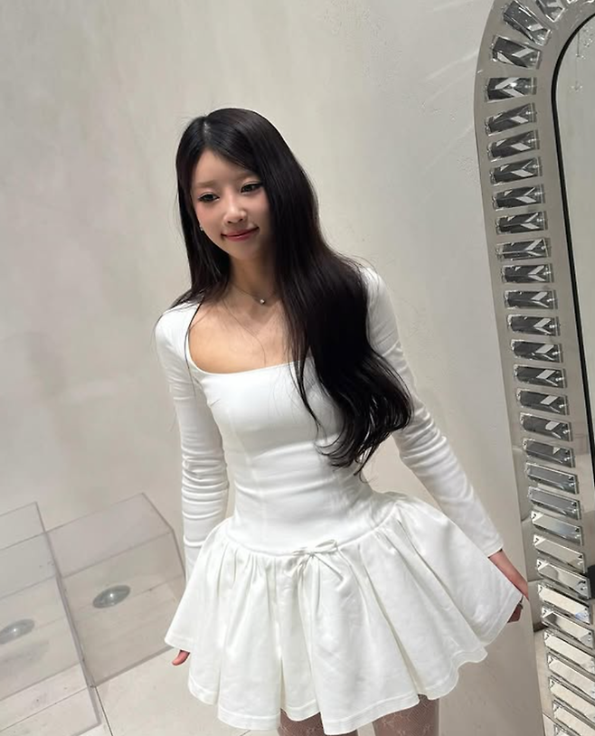 사진 속 이미주는 스퀘어 넥의 화이트 미니 원피스를 착용하고, 잘록한 허리와 가녀린 몸매를 드러내며 '하의 실종' 패션을 완벽히 소화했다.