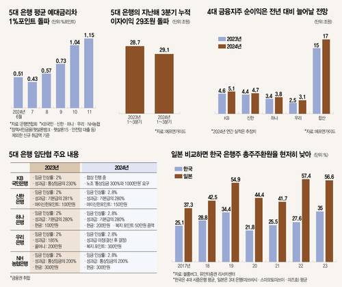 2024년 3분기까지 5대 시중은행이 벌어들인 이자 이익 규모다. 삼성전자, LG전자, 현대차 등 주요 제조업체의 영업이익을 모두 합친 금액을 크게 웃도는 금액이다. 상황이 이렇자 한편에서는 경제 불확실성과 고금리 상황 속에서도 은행은 막대한 이익을 쌓으며 국민 주머니에서 돈을 빨아들이는 ‘전당포 영업’을 한다며 비판한다. 은행 본연의 역할과 책임을 묻는 목소리 역시 덩달아 커지고 있다. 급기야 이재명 더불어민주당 대표가 6개 대형 은행장을 소집, 관련 의견을 청취하기도 했다. 은행권 이익 독식 논란. 그 속살을 들여다본다.