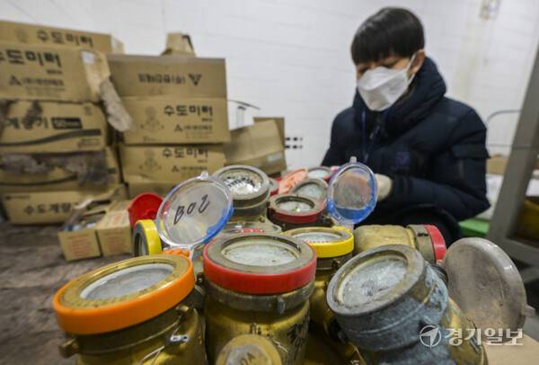 4일 경기지역 최저기온이 영하 16도까지 떨어지는 등 한파가 찾아오면서 도내 곳곳에서 수도계량기 동파가 잇따랐다. 이날 오전 수원시상수도사업소에서 직원이 동파된 수도계량기를 정리하고 있다.