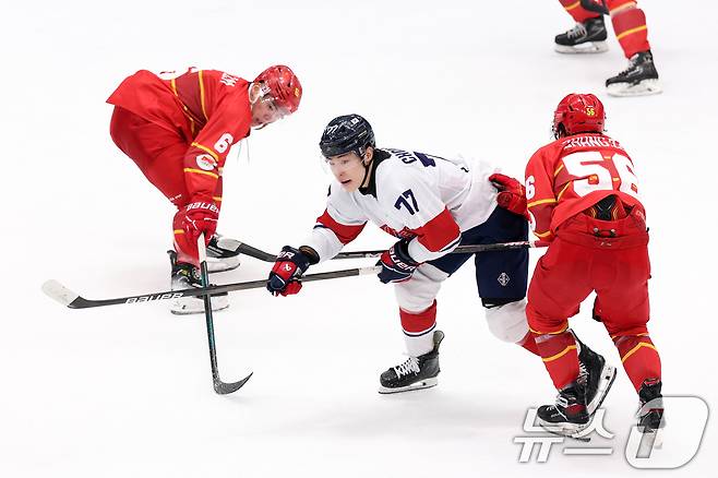 (하얼빈(중국)=뉴스1) 이승배 기자 = 4일 오후 중국 헤이룽장성 하얼빈 아이스하키 아레나에서 열린 하얼빈 동계아시안게임 남자하키 예선 A조 대한민국과 중국의 경기에서 이총민이 드리블로 수비를 빠져나가고 있다. 2025.2.4/뉴스1