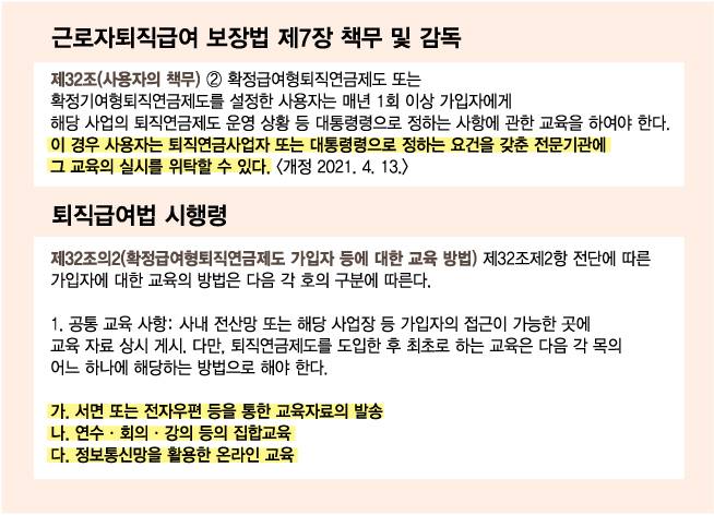 가입자 교육은 사용자(회사)가 담당해야 하지만 퇴직연금사업자(은행, 증권 등)에 이를 위탁할 수 있어 국내 기업 대부분은 사업자에게 교육을 맡기고 있다. 집합·온라인 교육 중 선택적으로 실시하고 서면과 기타 교육을 보완적으로 활용하는 구조가 대부분이다. 가입자가 체감할 수 있는 정기적 교육은 사실상 없는 셈이다.
