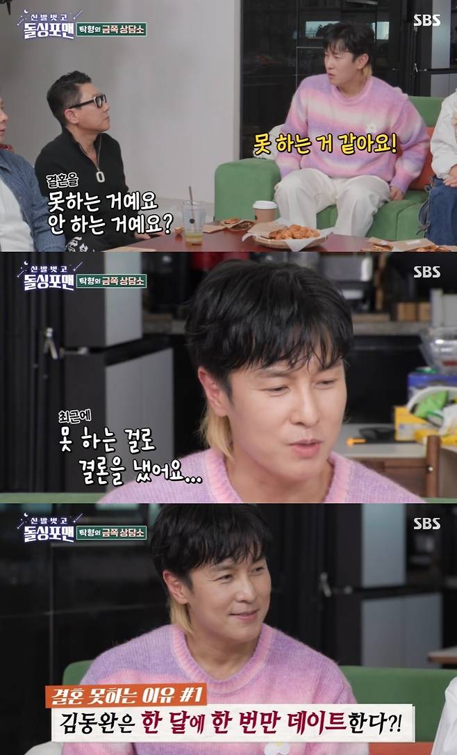 이날 방송에서 김동완은 "결혼을 안 하는 거냐 못 하는 거냐"는 질문에 "안한 게 아니라 못한 것"이라고 답했다.