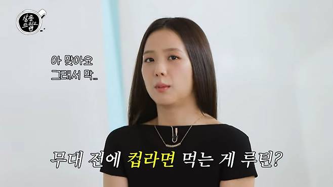 지수는 "회사에서 다이어트를 하라고 하면 '전 통통한 제가 좋다. 건강미, 제가 알아서 합니다'라고 했다. 그런데 뭐라 할 수 없는 느낌이었다고 하더라. 특이하다고 했다"고 전했다. 먹는 걸 좋아해서 연습실 앞 편의점을 몰래 갔다는 지수는 "연습생 때 편의점 앞에서 뛰는 사진도 찍혔다. 회사 사람들한테 들킬까봐 뛴 것"이라며 "멤버들도 같이 먹고, 나를 위해 뛰어줬다"고 이야기했다.