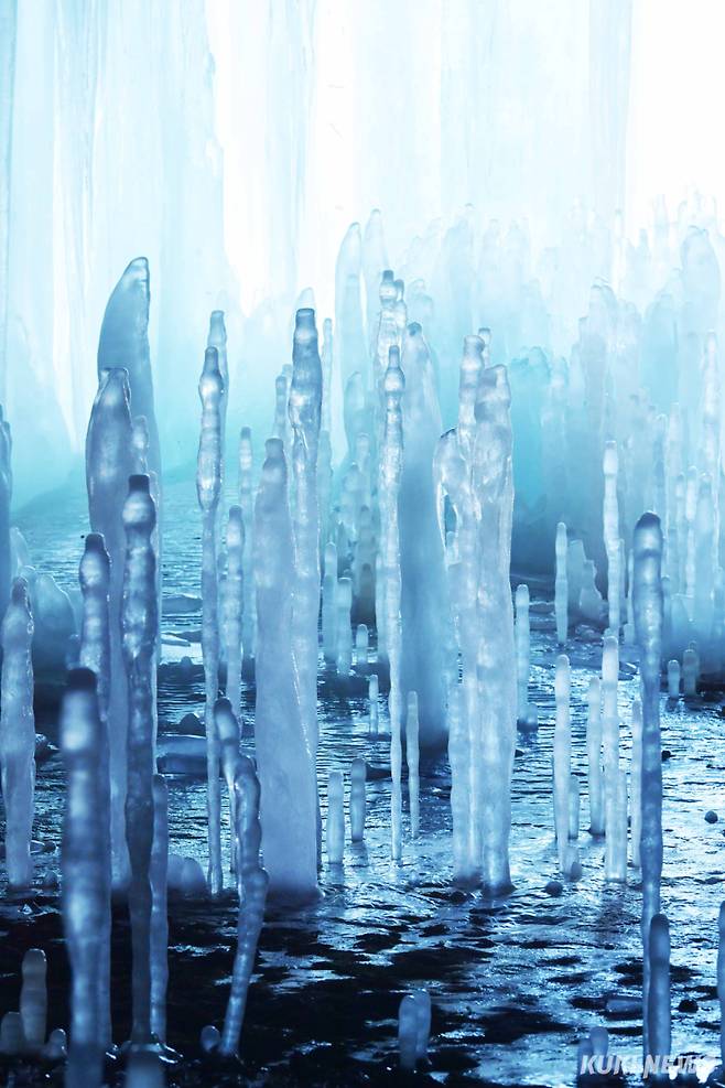 ‘다양한 형태의 역고드름’10cm도 채 안 되는 작은 것부터 1m가 넘는 수백 개의 얼음 기둥이 군상(群像)을 이루며 터널 천장을 향하고 있다. 터널 입구의 대형 빙주 뒤로 줄지어 자라는 역고드름은 대부분 촛농이 떨어진 양초나 대나무를 닮았지만 자세히 살펴보면 저마다 독특한 형태를 띠고 있다. 자연이 빚어낸 얼음 조각 작품들이 터널 속에서 신비로운 풍경을 만들어낸다.