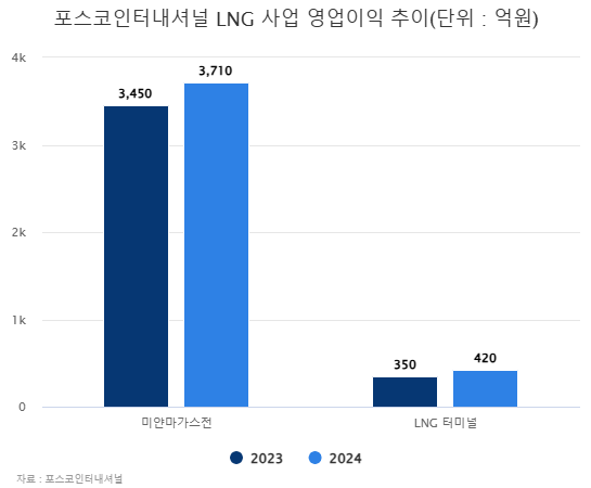 5일 포스코인터내셔널에 따르면 지난해 LNG 사업에서 실적 상승에 성공했다. LNG를 시추하는 미얀마 가스전 사업은 지난해 영업이익 3710억원을 기록, 전년 대비 7.5% 증가했다. 포스코인터내셔널 관계자는 “매장량 추가 인증으로 감가상각비가 감소하면서 이익이 늘어났다”고 설명했다.
