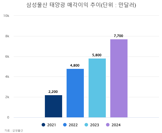 뛰어난 개발 능력을 인정받은 결과 삼성물산의 태양광 매각이익은 최근 4년래(2021~2024년) 기준 2억달러(2900억원)를 돌파했다. 지난해 기준 매각이익은 7700만달러(1120억원)로 전년 대비 32.8% 증가했다. 2200만달러(320억원)의 매각이익을 달성했던 2021년과 비교했을 때 3배 이상 늘었다.