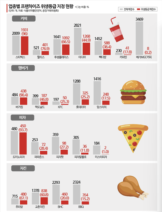 커피, 빵, 치킨, 아이스크림, 피자 등 25개 업종별 주요 프랜차이즈 업체의 위생 등급 현황을 분석한 결과 스타벅스는 올해 초 기준 2009개 매장 중 1931개 매장이 최고 점수를 받았다. 스타벅스 인증률은 96%에 달한다. 나머지 매장도 위생 등급제 신청을 추진 중이다. 커피 업종 프랜차이즈 가운데 할리스는 521개 매장 중 401개 매장이, 투썸플레이스는 1641개 매장 중 1092개 매장이 식약처의 위생 평가를 통과했다.