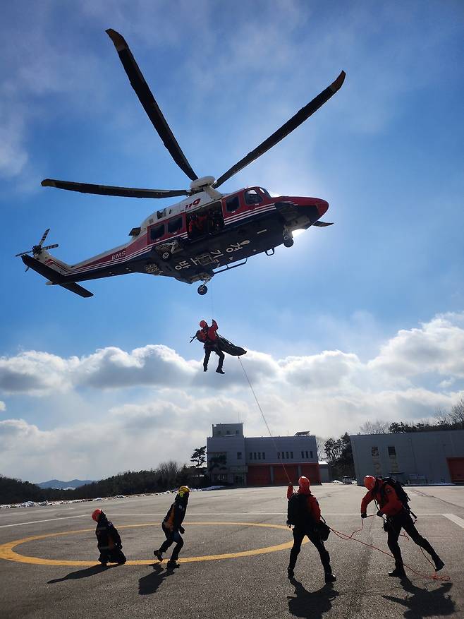 (용인=뉴스1) 김기현 기자 = 경기도특수대응단은 지난 4일 오후 재난 실전 대응력을 높이기 위한 '항공구조훈련'을 진행했다고 5일 밝혔다. 주요 목표는 소방헬기를 활용한 신속한 인명구조 기술 습득, 대원 간 협력 체계 강화 등이었다. 도 특수대응단으로 앞으로도 정기적인 항공구조훈련을 통해 대원 역량을 한층 더 강화해 나갈 계획이다. 김태연 단장은 "앞으로도 경기도민의 생명과 안전을 지키기 위해 최선을 다하겠다"고 말했다. (경기도소방재난본부 제공) 2025.2.5/뉴스1