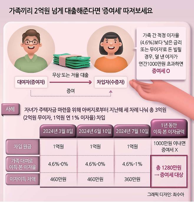 A. 지우 씨의 사례를 보니 아버지로부터 ▷작년 3월과 6월(각각 1억원·무이자) ▷작년 7월(1억원·이자율 연 1%)로 세 차례에 나눠서 빌리셨군요. 각 건당 2억원은 넘지 않지만, 이때는 1년 동안 빌린 ‘합계’로 따져본다는 점을 유의해야 합니다. 차입일을 증여일로 보고, 소급해서 1년 이내 ‘동일한 금전 거래’가 있는지 살펴보기 때문이죠.