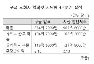 클라우드 부문이 부진했지만 알파벳의 두 자릿수 매출 성장률을 견인한 것은 검색과 광고 등 구글 서비스 매출이었다. 유튜브 광고를 포함한 구글 광고와 구글 검색 매출을 더한 구글 서비스 매출은 지난해 4·4분기 724억 6000만 달러로 전년 동기 대비 655억 2000만 달러에서 약 10.6% 증가했다.