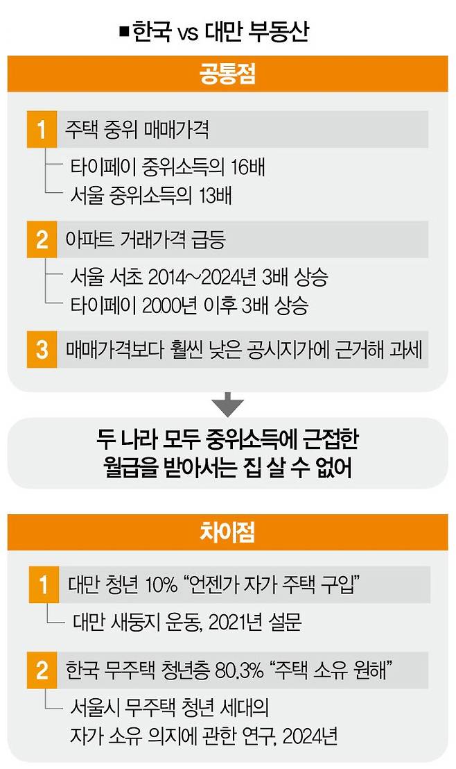 한국과 대만 부동산 시장은 구분하기 힘들 정도로 비슷하다. 도무지 살 수 없을 만큼 오른 집값, 40세 미만 보유자 비중이 10%가 안 되지만, 이미 집을 보유한 이들에게는 매매가격보다 훨씬 낮은 공시지가로 과세하는 것까지 같다. 하지만 두 나라의 청년을 구분하는 기준이 있다. 바로 주택 구매 의향이다.