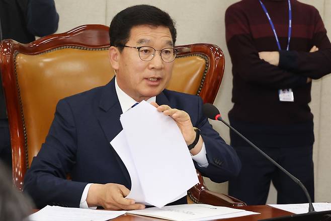 | ▲ 신정훈 국회 행정안전위원장(더불어민주당 소속)이 2024년 12월 5일 국회 행정안전위원회 전체회의에서 윤석열 대통령 비상계엄 선포 사태에 대해 이상민 행정안전부 장관에게 질의하고 있다. |