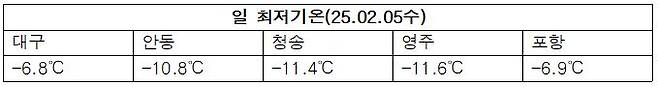 - 한파경보 : 경상북도(영주, 봉화평지, 경북북동산지)