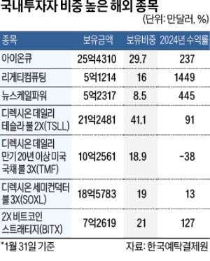 서학개미 열풍으로 투자처가 다변화하면서 한국 개인투자자가 주요 해외 종목의 ‘큰손’으로 떠오르고 있다. 지난해 3배 넘게 급등한 미국 양자컴퓨터 관련주의 한국인 보유 비중은 두 자릿수에 달했다. 다만 서학개미가 주로 담은 종목이 단기간 주가가 널뛰는 중소형주와 레버리지 상장지수펀드(ETF)인 만큼 투자에 유의해야 지적이 나온다.