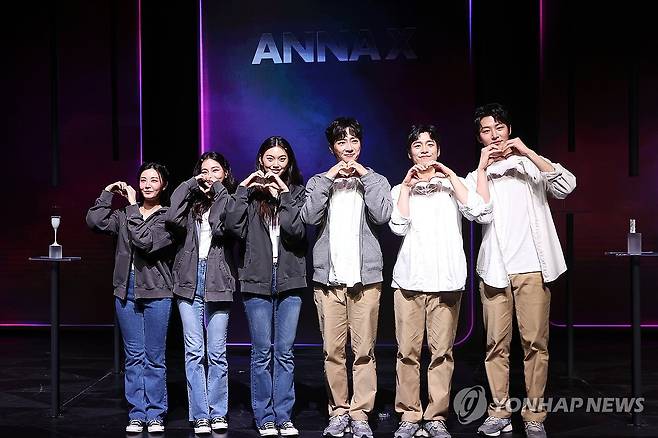 (서울=연합뉴스) 류효림 기자 = 배우 최연우(왼쪽부터), 한지은, 김도연, 이상엽, 이현우, 원태민이 5일 서울 강서구 마곡동 LG아트센터에서 열린 연극 '애나엑스' 프레스콜에서 포즈를 취하고 있다. 2025.2.5