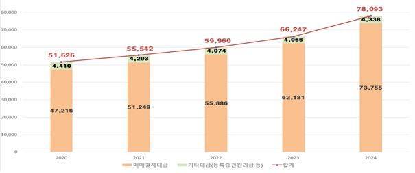 일평균 처리대금은 319조원으로 2020년(207조원) 보다 5년 새 1.5배로 늘었다.