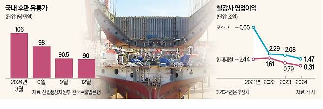 5일 철강·조선업계에 따르면 지난해 말 국내 후판의 평균 유통가는 t당 90만원이다. 지난해 1분기 말 106만원에서 9개월 새 15.1% 떨어졌다. 값싼 중국산 후판의 공습이 국내 제품 가격 하락의 원인이란 분석이 나온다. 중국산 후판 수입 가격은 약 75만원. 중국산 수입량은 2021년 47만t 이하에서 지난해 138만t으로 3배 가까이 증가했다.