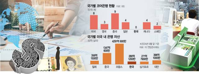 세계금융의 수도인 뉴욕에는 전세계 주요국의 은행들이 진출해 있다. 기축통화국인 미국과의 금융결제와 최대 시장인 미국에 진출한 자국 기업에 대한 지원이 목표다. 하지만 은행들의 자산 현황을 보면 한국 금융의 초라한 민낯이 그대로 드러난다. 미 연방준비제도(Fed·연준)에 따르면 미국 내 한국계 은행 법인과 지점이 보유한 자산은 지난해 9월 말 현재 280억 달러(약 40조 4800억 원)에 그쳤다.