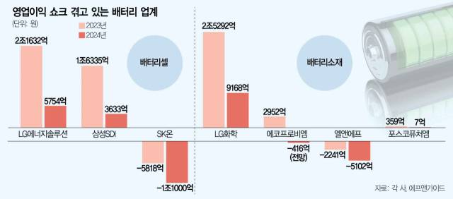실적 한파는 배터리 3사에 부품을 공급하는 소재사들에게도 몰아치고 있다. 코스닥 시가총액 1위를 기록하며 승승장구했던 배터리 소재 기업 에코프로비엠은 2023년 2952억 원 흑자에서 지난해 416억 원 적자가 예상된다. 2023년 2조 5292억 원의 영업이익을 냈던 LG화학도 지난해 영업이익이 9168억 원으로 64%나 급감했다. 포스코퓨처엠(7억 원)과 앨엔에프(-2241억 원)도 지난해 실적이 크게 악화됐다.