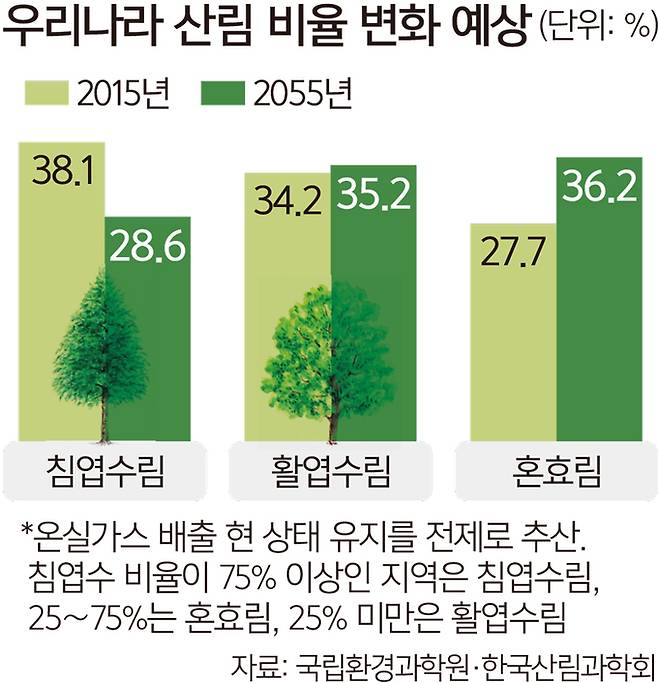 실제 우리나라 산림은 2015년 기준으로 38.1%이던 침엽수림 비율이 10%포인트 가까이 떨어져 2055년 28.6%까지 내려앉는단 것이다. 반면 활엽수림과 혼효림(침엽수·활엽수 혼합 숲)은 같은 기간 각각 1.0%포인트(34.2%→35.2%), 8.5%포인트(27.7%→36.2%) 증가했다.