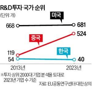 28조원(2013년)→324조원(2023년). 세계 연구개발(R&D) 투자 상위 2000대 기업에 포함된 중국 기업의 투자액 변화다. 10년 동안 11.5배 증가했다. 같은 기간 명단에 이름을 올린 중국 기업 수도 119개에서 524개로 405개 늘었다. R&D 투자가 ‘부동의 1위’ 미국과 ‘급성장하는 2위’ 중국 중심으로 쏠리고 있다. 첨단기술 경쟁에 대응하기 위해 한국 정부의 대책 마련이 시급하다는 진단이 나온다.