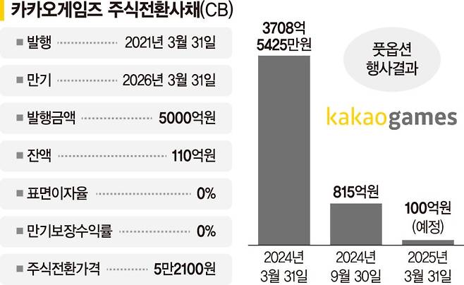 5일 금융투자업계에 따르면 카카오게임즈가 지난 2021년 3월 말 발행한 CB 잔액은 110억원으로, 이 중 100억원에 대한 조기상환청구가 들어왔다.
