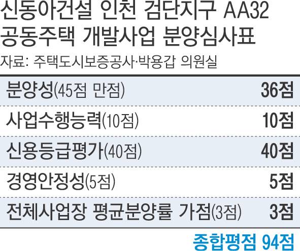 신동아건설은 보증발급 분양보증심사에서 신용평가등급(40점), 경영 안정성(5점), 사업수행능력(10점) 등에서 모두 만점을 얻어 총 94점을 받았다. 재정 상태가 이미 악화해 있었는데도 사실상 만점에 가까운 높은 점수를 받은 것이다.