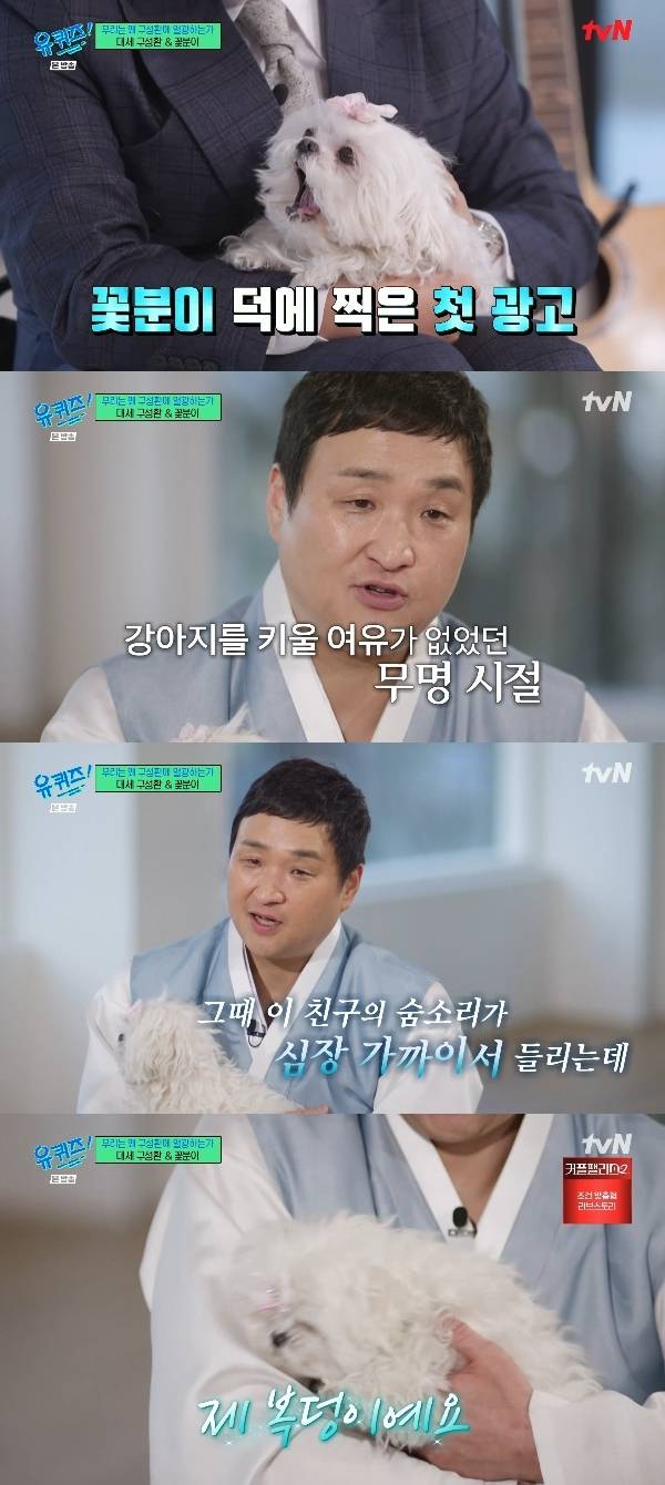 5일 방송된 tvN ‘유 퀴즈 온 더 블럭’(이하 ‘유퀴즈’)에서는 데뷔 20년 만에 전성기를 맞이한 구성환이 반려견 꽃분이와 함께 출연하며 유쾌한 입담을 자랑했다.