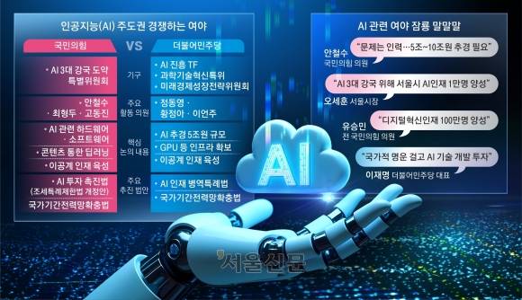 국민의힘은 AI 산업 경쟁력 강화를 위해 ‘AI 3대 강국 도약 특별위원회’도 최근 출범시켰다. 특위 위원장을 맡고 있는 안철수 의원은 서울신문과의 통화에서 “중국은 1800조원, 미국은 5000억 달러(약 720조원)를 투자하는데 우리나라도 10분의1 수준인 5조~10조원의 AI 추경은 해야 따라잡을 수 있다”며 “하드웨어 구입, 소프트웨어 연구개발(R&D), 인재 양성, 인문학 결합 AI 콘텐츠 개발 등 크게 4개 트랙으로 지원하자는 것”이라고 했다. 그러면서 “특히 인재 양성은 시간이 오래 걸려 지금 당장 시작해야 한다”고 강조했다.