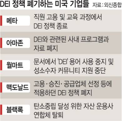 페이스북과 인스타그램을 운영하는 메타, 아마존 등 빅테크 기업, 맥도날드·월마트·타깃 등 미국 전역에 자리 잡은 대기업들이 줄줄이 DEI와의 결별을 선언하고 있다.
