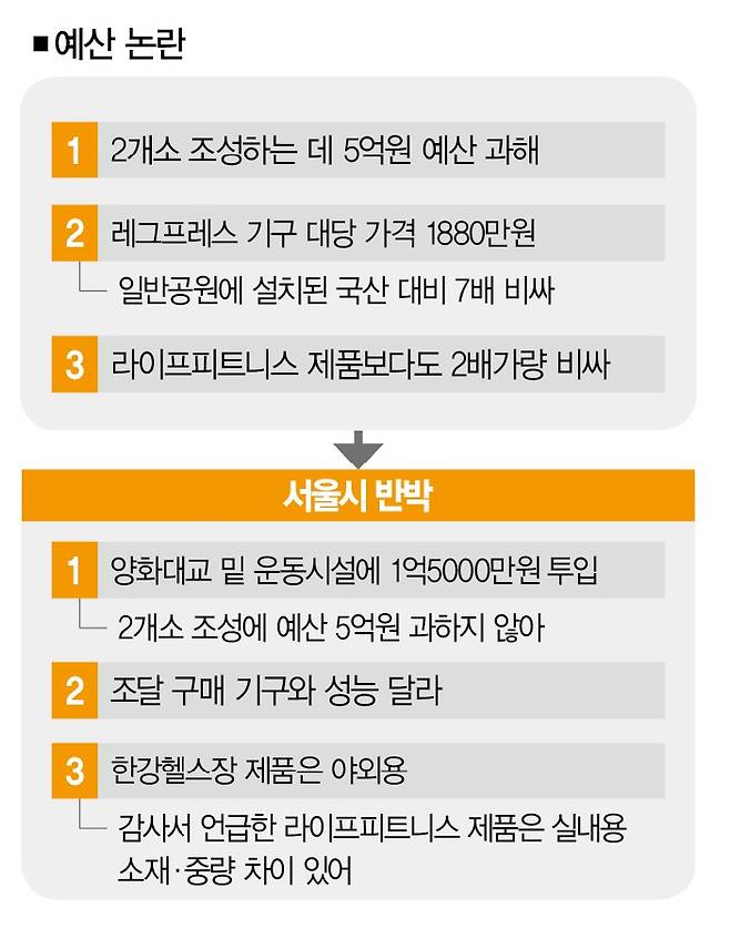 그는 또 "공공 조달 구매로 설치한 양화대교 밑 운동시설에는 1억5000만원을 투입했다"면서 "강서ㆍ광나루 한강헬스장 2개소를 조성하는 데 5억여원이 들었으니 과하거나 무리한 예산을 집행한 건 아니다"고 주장했다.