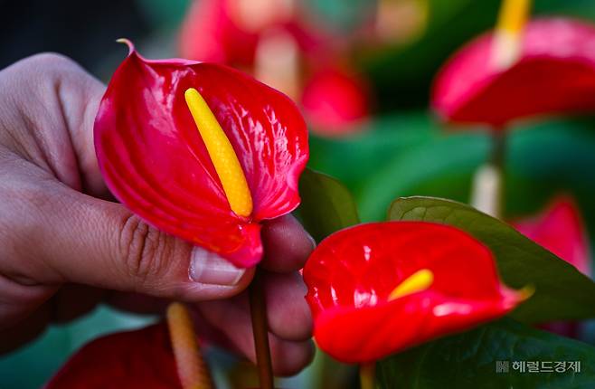 [헤럴드경제(용인)=임세준 기자] 겨울 한파 연일 지속되는 가운데 봄을 염원하듯 온실 속 꽃들이 아름답게 자라나고 있다. 5일 오후 경기도 용인시의 한 농원에 안스리움이 출하를 앞두고 활짝 만개해 있다.