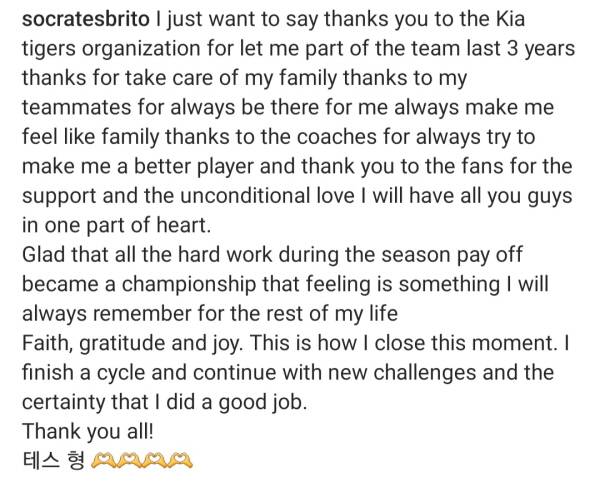재계약이 불발된 소크라테스는 KIA와 팬들에게 진심을 담아 감사한 마음을 전했다. 그는 SNS에 자신의 활약상이 담긴 하이라이트 영상과 함께 "지난 3년간 팀에 함께 할 수 있게 해주신 구단에 감사하다고 말하고 싶다. 가족처럼 항상 곁에서 힘이 되어준 팀 동료들과 항상 더 좋은 선수가 될 수 있도록 노력해 주신 코치님들, 항상 응원해 주시고 무조건적인 사랑을 보내주신 팬분들께도 감사드린다. 모든 분 마음 한편에 간직하겠다"고 밝혔다.