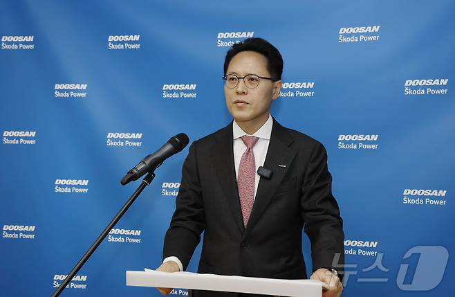 (서울뉴스1) 최동현 기자 = 6일(현지시간) 체코 프라하 증권거래소에서 열린 두산스코다파워 상장 기념식에서 두산에너빌리티 박상현 사장이 기념 축사를 하고 있다.(두산에너빌리티 제공) 2025.2.6/뉴스1