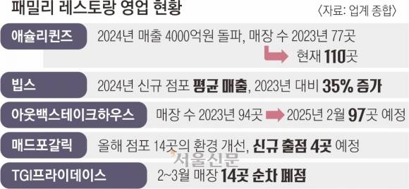 패밀리 레스토랑 중에서 선전하는 곳은 단연 이랜드이츠의 뷔페 애슐리퀸즈다. 지난해 매출 4000억원을 돌파하는 등 2023년(2360억원) 대비 약 70% 성장했다. 지난해 12월엔 최대 월매출을 달성했으며 매장 수도 2023년 77곳에서 지난해 말 110곳으로 늘었다.
