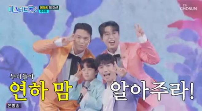 6일 TV조선 '미스터트롯3'에선 메들리 팀 미션으로 펼쳐진 가운데 천록담, 유지우, 강훈, 임찬이 뭉친 쥬쥬핑 팀의 공연이 공개됐다.