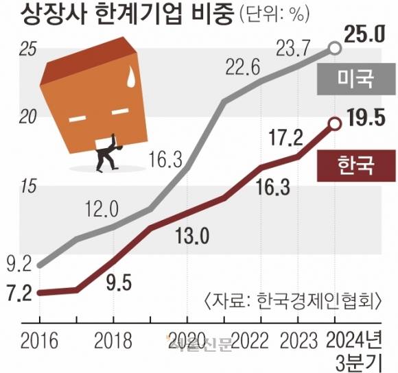 한국의 한계기업 비중 변화를 살펴보면 2016년 7.2%(163곳)에서 2024년 3분기 19.5%(440곳)로 12.3% 포인트 증가했고, 미국은 9.2%(2016년)에서 25.0%로 15.8% 포인트 증가했다.